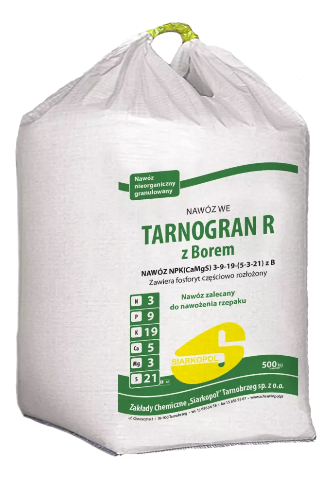 Tarnogran R призначається для збільшення врожайності олійних культур. До складу добрива входять хімічні сполуки з різною швидкістю вивільнення в грунт, це дає змогу рослинам використовувати поживні речовини з гранул протягом всього періоду вегетації. Стартова доза азоту забезпечує належний початковий ріст рослин. Фосфор у добриві міститься у формах, що забезпечують швидку і повільну розчинність. Калій у формі, що легко розчиняється у воді, сполучений в гранулах із сульфатом магнію, вивільняється з неї повільно, забезпечуючи тим самим належне живлення рослин в наступних фазах розвитку.Магній в сірчаній формі забезпечує краще засвоєння інших поживних речовин. Сірка, що міститься у великій кількості, також має сульфатну форму-доступна для рослин протягом усього вегетаційного періоду. Бор приймає участь в процесах цвітіння та завязування плодів.
